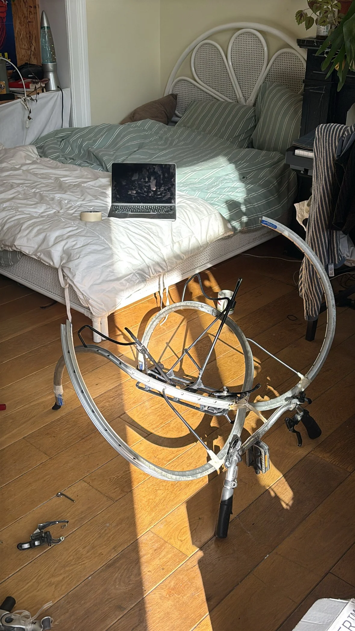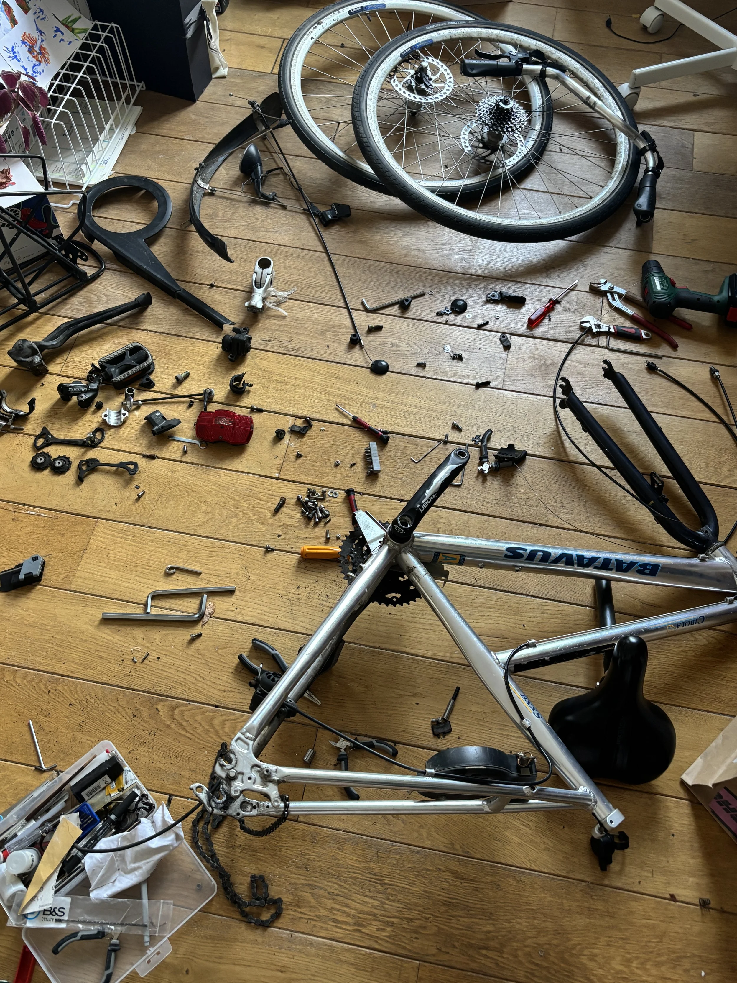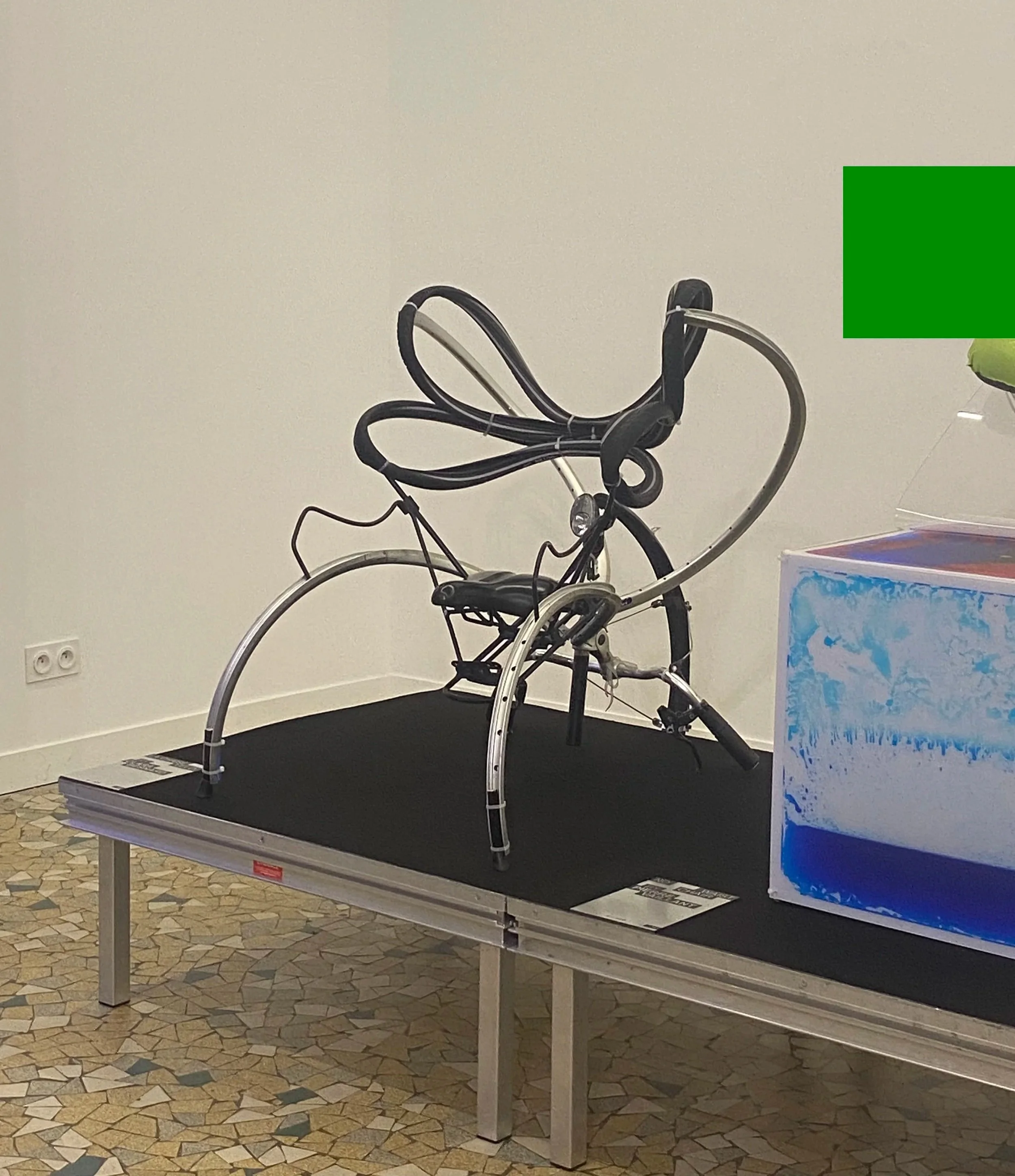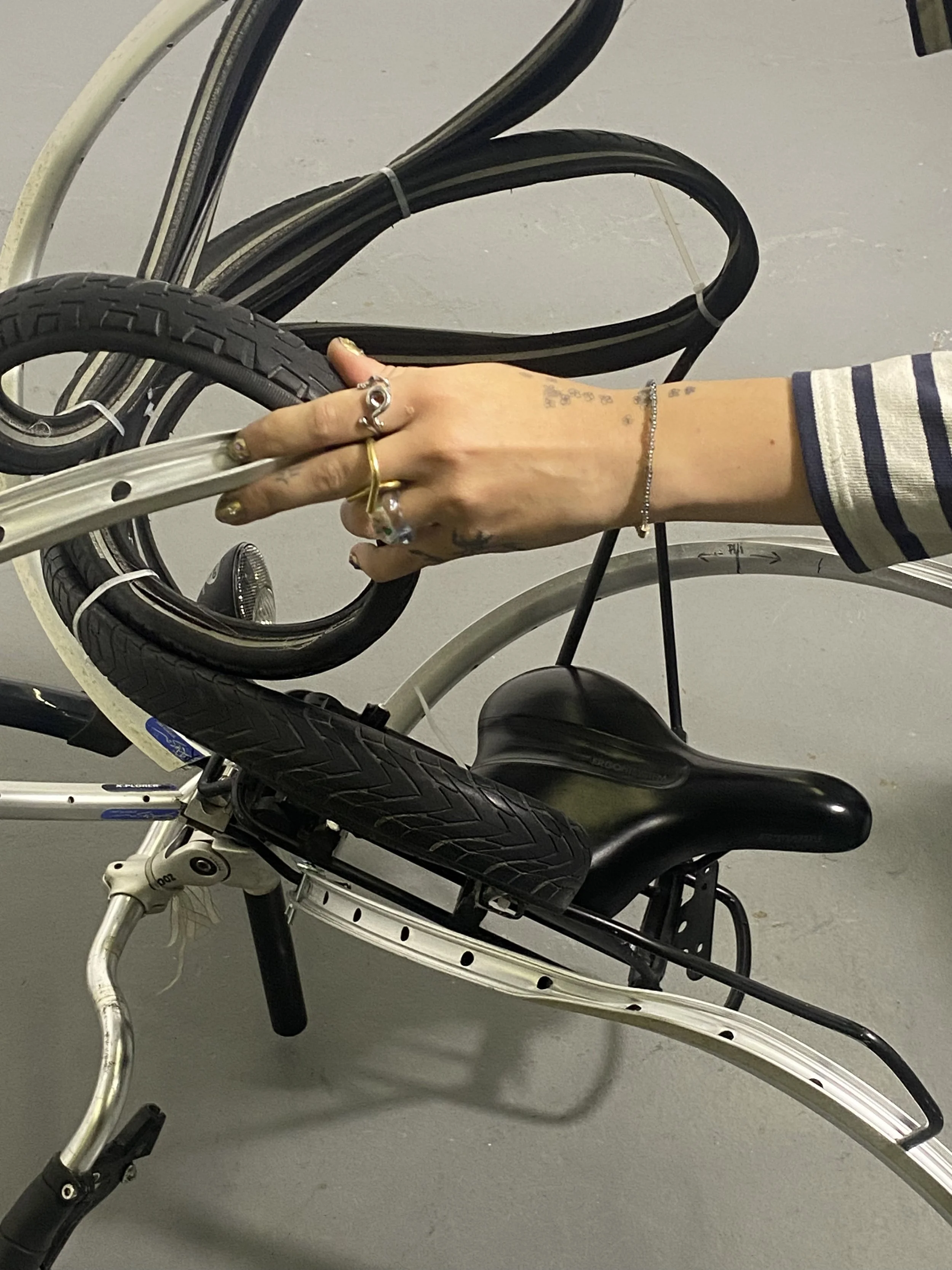 La chaise vélo is a metaphorical yet functional chair made with an old bike. The experiment behind this piece was about creating a common object, a chair, only out of another common object, a bike. Nothing’s added, all that chair is composed with is from the original bike. It’s about a mechanical twist, like an organical transformation of a living object.